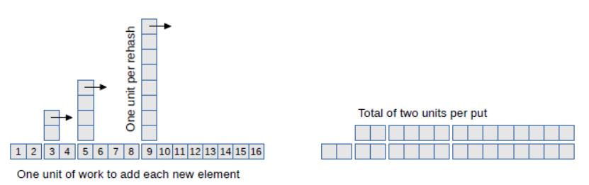 我们第一次调用put时,它需要1个工作单位。第二次也需要1个单位。第三次我们需要rehash,所以需要2个单位重新填充现有的键,和1个单位来对新键哈希。