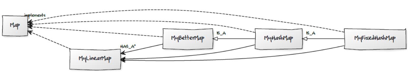 • MyHashMap扩展了MyBetterMap,所以它也包含MyLinearMap对象,并实现了Map