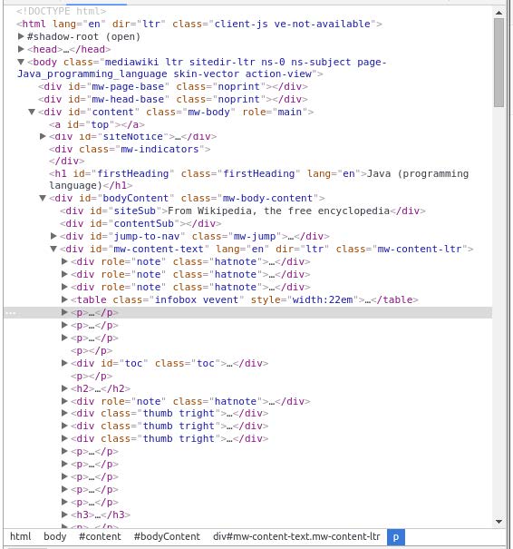 图 6.2 展示了维基百科 Java 页面(http://thinkdast.com/java)的 DOM 截图。高亮的元素是文章正文的第一段,它包含在一个<div>元素中 ,带有id="mw-content-text"。我们将使用这个元素 ID 来标识我们下载的每篇文章的正文。